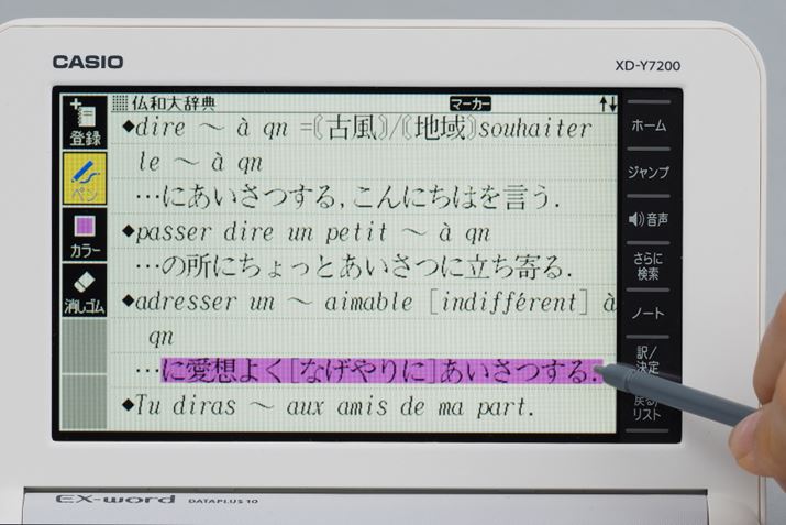 ご覧のとおりXD-Y7200はほぼ文庫本サイズと非常にコンパクト。なので、つねに携帯し、とにかく気になるフランス語は片っ端から調べていく。そんなことから始めてみることにします。そして、同僚を巻き添えに最初の目標を「仏検5級合格!」に設定。今から学習してどこまで習得できるかわかりませんが、結果をお楽しみに……(実は3月から勉強を始めています)。