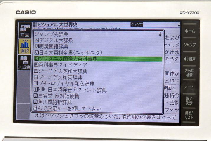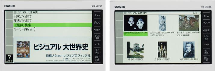 そして、ありがたいようで困ったのが、フランス語以外のコンテンツが案外興味深く、つい脱線してしまうこと(笑)。XD-Y7200には、フランス語学習以外のそのほかのビジュアル系や音楽系の事典類コンテンツや、著作権の切れた日本文学2000作品/世界文学1000作品、収録されています。事典類は、検索した語句から横断して検索できてしまうものもあるので、インターネットで調べものをしているときに起こりがちな“気になるリンクをたどっていくうちに、最初に調べていたことからかけ離れてしまっていた”というあの状況がおきてしまうことも。暇つぶしにはもってこいなのですが、気を付けねつけねばなりません。