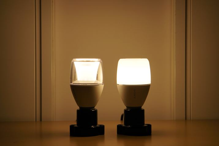 新モデルのLSPX-103E26では、この光学レンズグローブに乳白色拡散素材を新たに採用するとともに、光学設計を見直すことで、明るさを示す全光束が従来比1.4倍となる500ルーメンにまで向上した。従来モデルのLSPX-100E26Jでも全光束360ルーメンを実現しており、寝室のベッドサイドなどの落ち着いた雰囲気の場面で使う分には問題ない明るさだったが、ソニーが提案するようなリビングやキッチンの照明を置き換えて使えるかというと、照明としての明るさが足りない感じがあったのだが、これなら積極的に置き換えられそうだ。