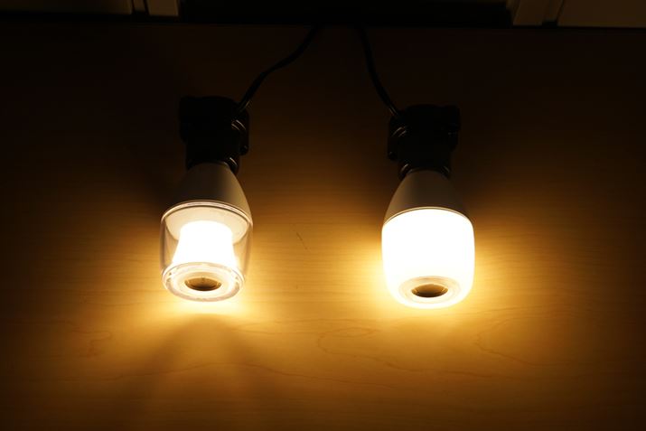 従来モデルのLSPX-100E26Jと、新モデルのLSPX-103E26の明るさを比較した写真だ。いずれも明るさを最大にした状態だが、明らかに新モデルのほうが明るく、光の広がりもムラがない