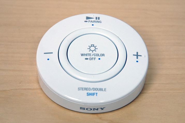 LED電球スピーカーに付属するリモコン。音楽の再生や停止、スピーカー音量の調整などが行えるほか、真ん中に配置されているダイアルボタンを使い、電球の明るさやカラーをコントロールすることもできる