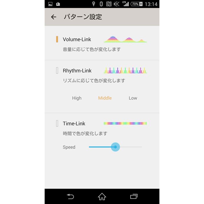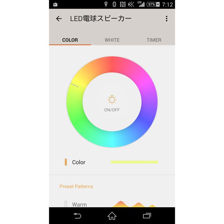 LSPX-103E26は、スマートフォンのアプリを使うことで、さまざまな機能を利用できるのもポイントだ。なかでも、調色機能を活用した「音楽連動モード」が面白い。「Warm」「Cold」「Vivid」「Pastel」の4種類のプリセットモードや、自分好みにカスタマイズできる「カスタムモード」が用意されており、音楽のリズムや音量にあわせて、LED電球スピーカーの照明のカラーが次々に変わっていく。電球から音が出るだけでもかなりインパクトがあるのに、そのから再生される音に合わせて色が変わるなんて、一気に注目を集めること間違いなし。大人数のパーティとかは絶対に盛り上がれそうだ。