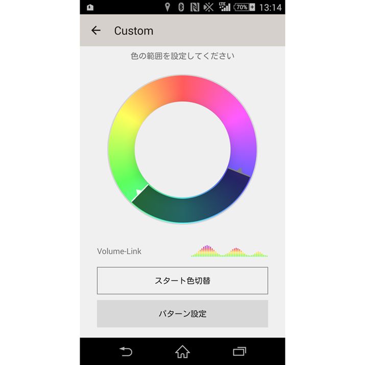 音楽連動モードでは、自分好みにカスタマイズできるカスタムモードも用意。表示するカラーの範囲を指定できるほか、何を基準にしてカラーを変化させるかといったことまで指定できる