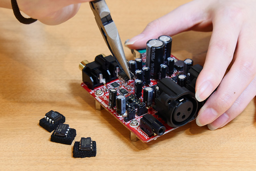 交換可能なオペアンプ。ラジオペンチや専用の引き抜き工具を使用することで、簡単に外せる