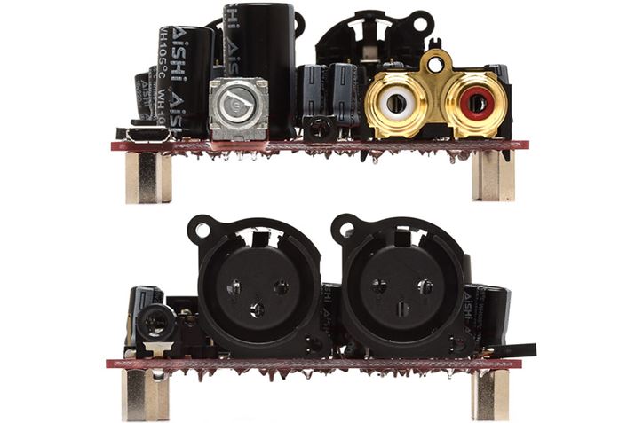 インターフェイスは、上段が左から順に、電源用のmicroUSBポート、ボリューム調整(RCA入力時はボリューム調整不可)、入力用の3.5mmステレオミニジャックとステレオRCA端子。下段は音声出力になっており、3.5mmステレオミニジャックと3ピンXLR端子が並ぶ