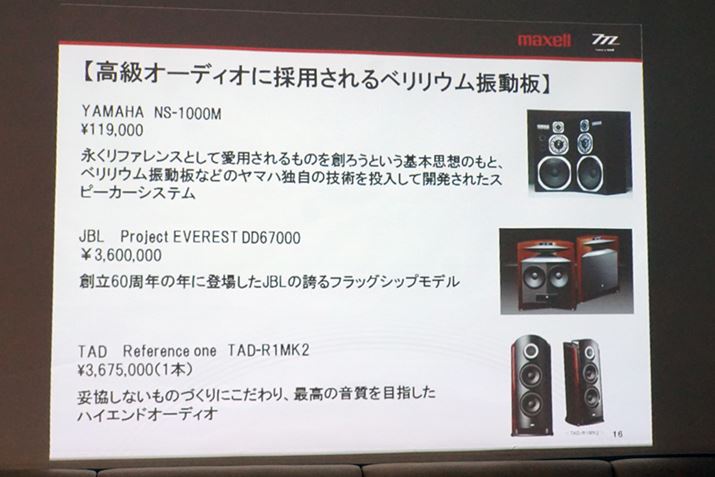 ベリリウムは、音の伝播速度が音速の36倍という圧倒的な早さが特徴。同社は“マッハ36”とアピールしていた