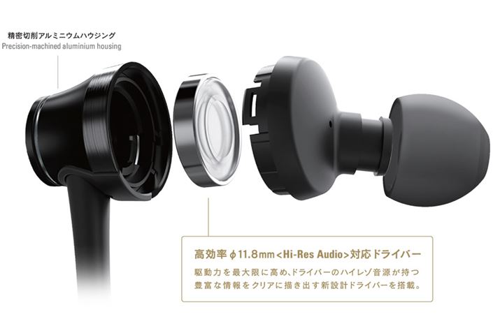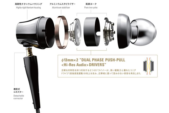 最大の特徴は、異口径のドライバー組み合わせた「DUAL PHASE PUSH-PULL <Hi-Res Audio>DRIVERS」を採用すること。13mm口径と10.4mm口径という異口径のドライバーを組み合わせたプッシュ/プル技術によって、特に高域特性を改善している。
