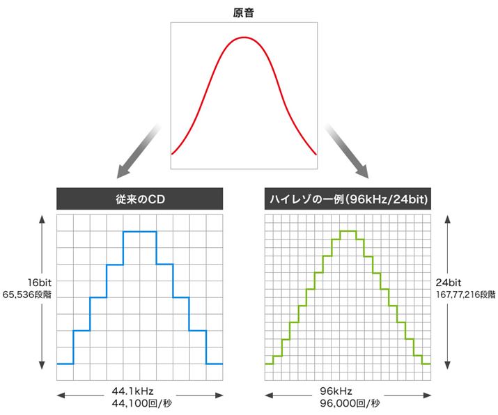 このサンプリング周波数と量子化bit数の数が大きくなれば大きくなるほど、より小さく細切れにでき元の波形に近づく。具体的には、ハイレゾの一例である「96kHz/24bit」をCD(44.1kHz/16bit)と比べると、1秒間のサンプリング数は、44,000回から96,000回へと約2倍に、各サンプリング時の音の大きさは65,536段階(16bit)から167,77,216段階(24bit)へと、256倍もきめ細やかになる。イラストはイメージだが、「96kHz/24bit」のほうが、階段が細かく「原音」の滑らかな波形に近い(=高音質)ことをご理解頂けるだろう。