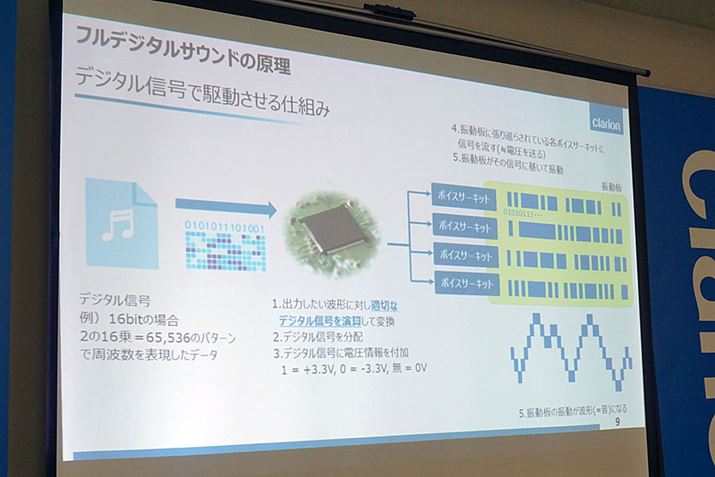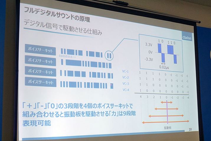 具体的には、専用のLSIを用いて入力されたデジタルデータをアナログ信号に変換せず、「ボイスサーキット」と呼ばれる振動板にダイレクトに電圧をかけて駆動させている。ZH700FFには4つのボイスサーキットがあり、LSIが入力されたデジタル音源のデータを解析し、それぞれのボイスサーキットに+3.3V、-3.3V、0(null)の3種類のうちのいずれかの電圧をかけ、電圧の組み合わせにより-4から+4までの9段階の力で振動板の駆動を制御している。この9段階の力の制御を0.02μsという非常に短い時間周期でコントロールすることで、非常に滑らかな音の表現を実現しているというわけだ。