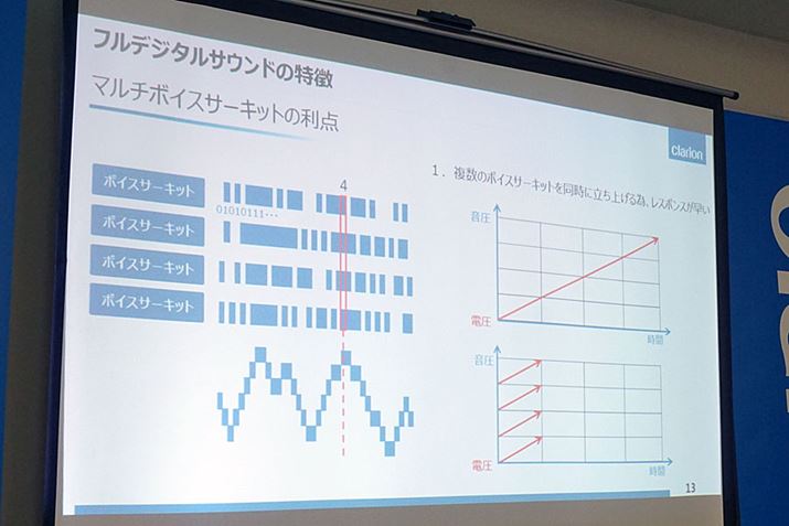 理論上はボイスサーキットの数が多ければ多いほど細かな音の表現が可能になるが、現状のLSIの処理性能と、ボイスサーキットの数が増えることでLSIの処理が重くなって消費電力が増えてしまうこともあり、ZH700FFでは4つのボイスサーキットを採用したとのこと。ちなみに、車載用で展開しているフルデジタルサウンドシステムには、6つのボイスサーキットを採用している。
