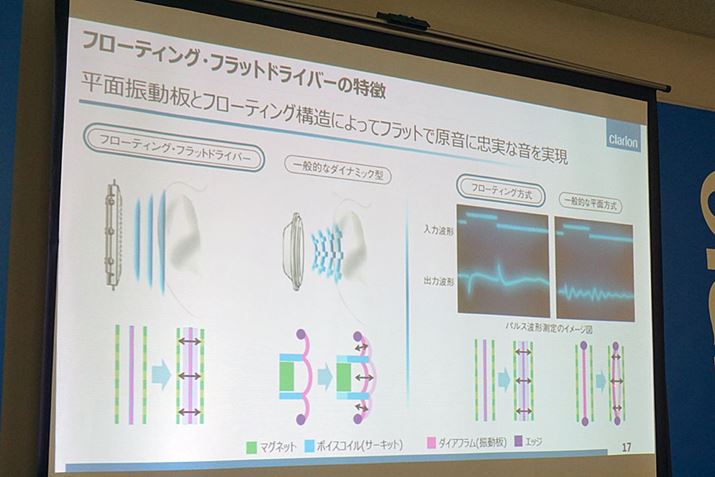 またZH700FFでは、音源を劣化させずに振動板をダイレクトに駆動できるというフルデジタルサウンドシステムの特徴を最大限に生かすため、「フローティング・フラットドライバー」と呼ばれる独自の平面駆動タイプのドライバーユニットを新たに開発。ボイスサーキットを張り巡らせたシート状の振動板を磁力で浮かせ、振動板の面全体を均一に駆動させることで、一般的な平面駆動方式に比べ、歪みの少ないフラットでクリアなサウンドを実現しているという。