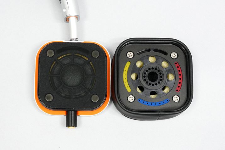 イヤーパッド裏面に用意されている低音調整機構「modi:fiテクノロジー」。上下左右それぞれに設けられた空気穴の大きさが異なっているのがわかる。上側のマグネットの間にあるスリットと、色分けされた空気穴の位置を合わせることで、低音調整ができるようになっている。それぞれ色分けされているため、見た目からしてわかりやすい