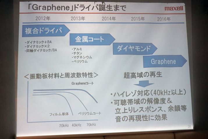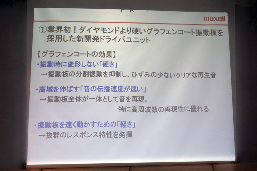 新しいイヤホン用のドライバーユニットを開発するにあたり、さまざまな素材を試したという。ダイヤモンドをコーティングすることも検討したそうだが、最終的に上記のような特性を持ったGrapheneを採用したという