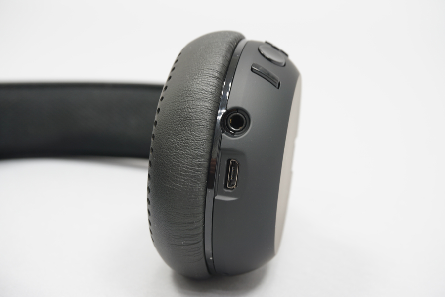 右ハウジングには、スマホ操作用の3ボタン、有線接続用3.5mmステレオミニジャック、内蔵バッテリー充電用microUSBポートが用意されている