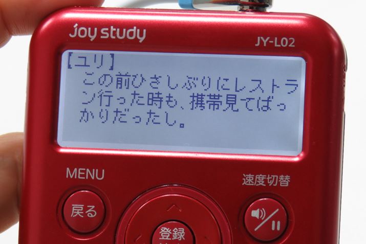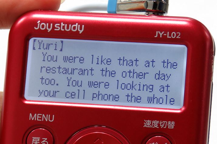 英語を学習するためのデジタルツールにはいろいろなものがありますが、「joy study JY-L02」は英語リスニングに特化した英会話学習機。基本的には収録されたコンテンツを「聞く←→真似して言ってみる←→意味を理解しながら聞く←→真似して言ってみる」を繰り返す。以下の動画でわかるように、とにかく文法などは気にせず、画面に表示される英会話と日本語訳を確認しつつ繰り返し繰り返し聞くという、機能的にはかなり割り切ったシンプルな学習機なのです。