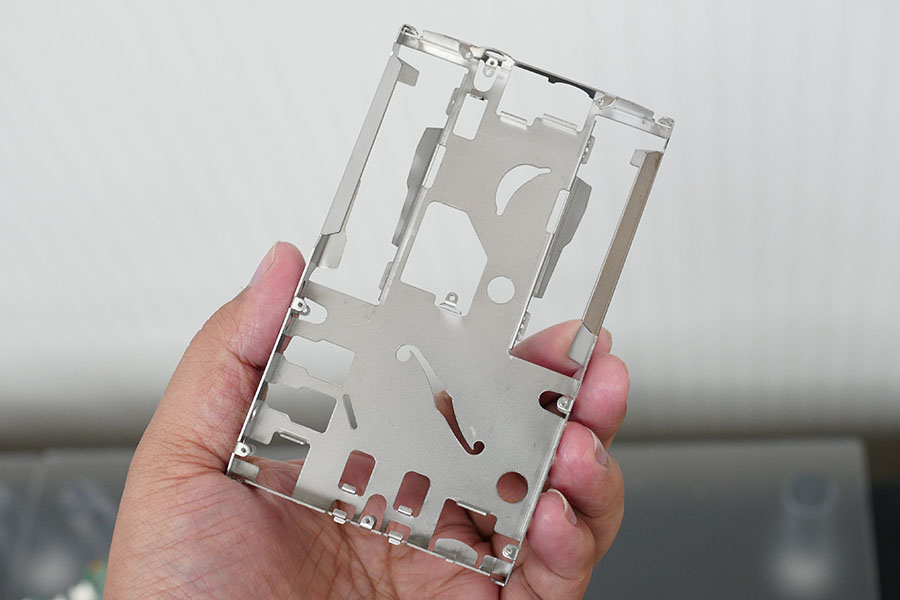 基板を固定するステンレスシャーシ。従来よりも厚みを増し強度を上げている。