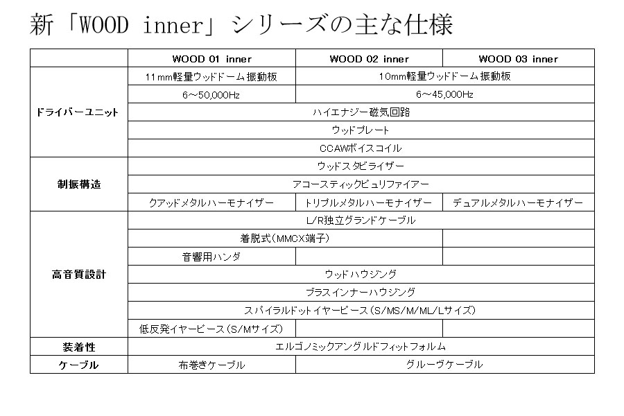 特に上位モデルの「WOOD 01 inner」では、11mm径の振動板や4種類の金属を組み合わせた制振構造に加えて、MMCXコネクタを採用した着脱ケーブルのほか、音響用ハンダや布巻きシールド野採用など、高音質設計が随所に施されている。各製品の主要なスペックは以下のとおり。