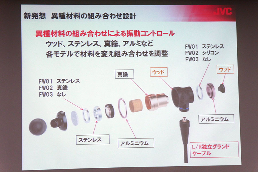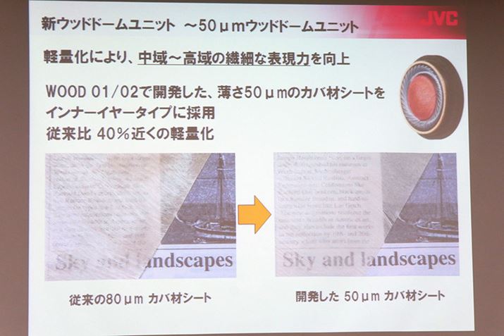 新しい「WOOD inner」シリーズは、従来シリーズから内部パーツを大きく変えている。特に2015年にCLASS-Sシリーズのヘッドホンとして登場した「HA-SW01/02」で培われたノウハウを、新WOOD innerシリーズでは積極的に取り入れている。なかでも特徴となるのは、ウッドドームユニット内に搭載される厚さ50μmの木の振動板。従来比40%ほどの薄さになり、軽量化された分、高い瞬発力を実現しているという。また、高い磁束密度を生み出す「ハイエナジー磁気回路」によって、強力な駆動力を得たことで、低音の音階表現も向上させている。