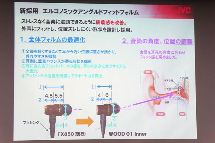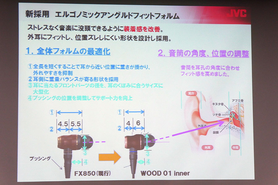 外耳にフィットし外れにくい「エルゴノミックアングルフィットフォルム」を採用。見た目は従来モデルから変わってないように見えるが、重量バランスや端子の位置などを細かく変えている