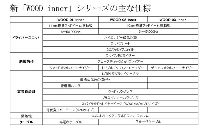 ラインアップは、上位モデルの「WOOD 01 inner」、スタンダードモデルの「WOOD 02 inner」、ベースモデルの「WOOD 03 inner」の3モデルで、いずれもハイレゾロゴを取得している。価格は、「WOOD 01 inner」が50,000円前後(税別)、「WOOD 02 inner」が35,000円前後(税別)、「WOOD 03 inner」が24,000円前後(税別)。