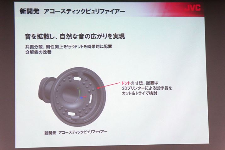 また、ウッドスタビライザーでは内部の背圧を調整し、振動を抑えクリアなサウンドを実現。ノズル側ハウジング内部に設けられた無数のドット構造を指すアコースティックピュリファイアーによって、音を拡散調整し分解能を高めているとのことだ。