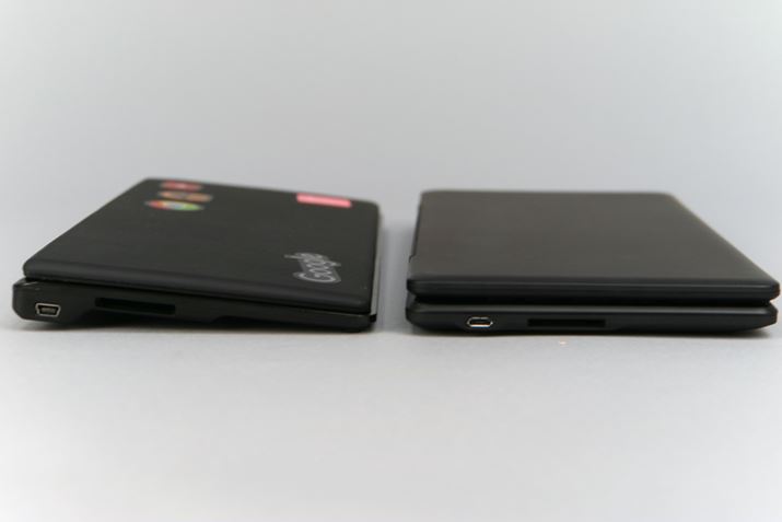 左がDM100、右がDM200。キーボード面の傾斜がなくなっているのは残念。外部インターフェイスは、USB2.0(microBタイプ)とSDメモリーカードスロット(最大32GB)を備える