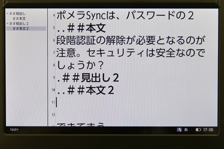 アウトライン機能は、文頭に「.」や「..」を入れると階層構造となる。ポメラSyncなどで同期すると「.」「..」は消え、単純なテキストファイルとなる