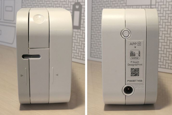 電源ボタンは本体左側面(左)、テープ出口とテープカッターレバーは右側面に配置(右)。ACアダプター(別売)も使用でき、電源ボタンの下にジャックが用意されている