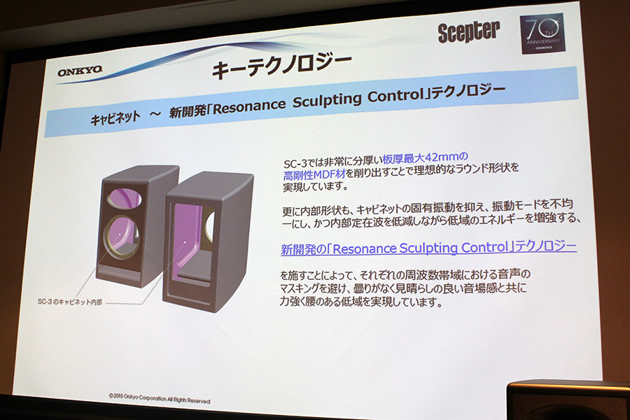 オンキヨーの創業70周年に合わせて開発された、高級スピーカー「Scepter」シリーズの最新モデル「SC-3(B)」
