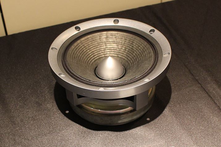 鋼鉄の1/5の軽さで5倍以上の強度を持つというバイオマス素材CNF(セルロースナノファイバー)と、パルプを独自の比率で配合したONF(オンキヨーナノファイバー)振動板。オンキヨー独自のプレスを行わないコーン成形で作られている。フレームには高強度のアルミダイキャストを使用している