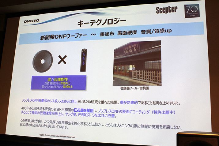 ウーハーは、特許出願中のバイオマス素材CNF(セルロースナノファイバー)とパルプを配合した、軽くて強いONF(Onkyo Nano Fiber)振動板を採用。オンキヨー伝統のプレス加工を行わないノンプレスコーンによって成形した。ユニークなのはコーンの表面に、奈良の老舗墨ブランド「古梅園」の紅花墨(こうかぼく)を塗布していること。これにより、表面の伝搬速度が向上するのに加えて、内部ロスやS/N比も改善。音の抜けがよく、分厚い低音を再現できるという。