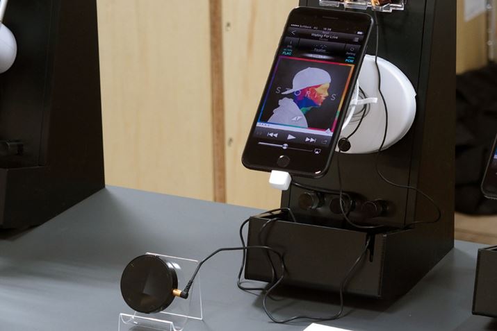イヤホンジャックが廃止された最新のiPhone7には、Astell&Kernとソフトバンクが共同開発したワイヤレスポータブルアンプ「XHA-9000」を接続して展示