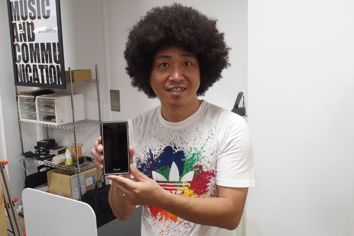 e☆イヤホンを運営するタイムマシンの大井裕信社長。手に持っているのは、MARSHALLが開発した日本未発売のハイレゾ対応スマートフォンだ
