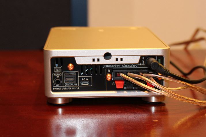 幅110mmのボディの裏面には、スピーカー出力端子のほか、USB-A、USB-B、光デジタル、アナログオーディオの各入力端子がまとめられている