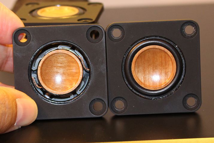 直径30mmのフルレンジの凹型ウッドドームドライバー。親指のサイズと見比べてみると極めてコンパクトになっていることがわかる。内部が見えるようになっている左側のドライバーでは、フィルム状の蝶型ダンパーが確認できる