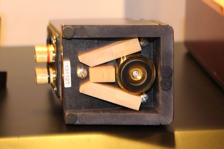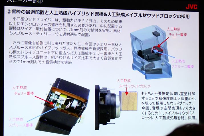 また、小型ドライバーの駆動力を補うために、エンクロジャーの響きを最大限利用する内部デザインもポイント。従来のウッドコーンスピーカーで採用された熟成スプルース響棒に加えて、今回のモデルでは新たに熟成チェリー響棒も追加。これによりスピーカー面より後ろに定位しやすい小型スピーカーの音像を前側に出させるという。響棒の組み合わせるサイズ比率で音質が変化するため、1mm刻みで音質検討を重ねて仕上げたとのことだ。また、ドライバーユニット後部にはメイプルウッドブロックを貼り付け。不要振動を抑えるとともに、解像度や空間表現の向上にも貢献しているという。