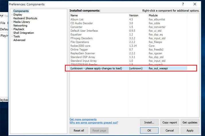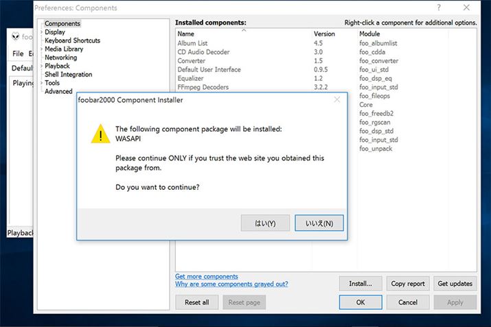 ダウンロードしたコンポーネントは、ダブルクリックでインストールできる。途中でインストールの確認があるので、そのときは「はい(Y)」を選んで進める。すると、インストールされたコンポーネントの一覧に、「WASAPI output support」(またはfoo_out_wasapi)が追加される。表示されていれば「Apply」ボタンを押して反映させる。ボタンを押さないと更新が反映されないので忘れずに行うようにしよう。