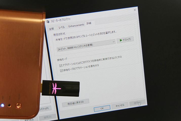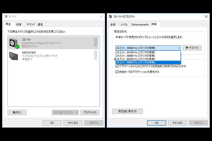 今回は、再生デバイスとして、AudioQuestのUSB DAC「DragonFly Black」を使用している。使用したいデバイスを選択し、プロパティを開いて詳細タブの「既定の形式」と「排他モード」をチェックしよう。