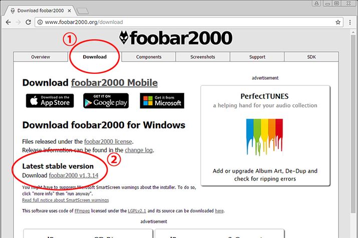 それでは実際にfoobar2000をインストールしよう。公式サイト(http://www.foobar2000.org/)にアクセスし、「Download」ボタン(1)をクリックしたあと、Latest stable versionの「foobar2000 v1.3.14」のリンク(2)をクリック(2017年1月13日時点)。これでfoobar2000の本体をダウンロードできる。とても簡単だ。
