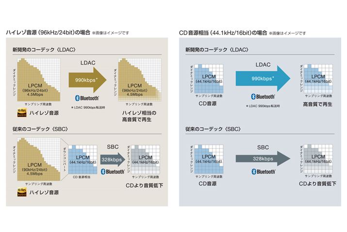 最大96kHz/24bit、ビットレート990kbpsでのBluetooth伝送に対応したLDAC。aptX HD数字的にはaptX HDよりも伝送できる情報量は多い