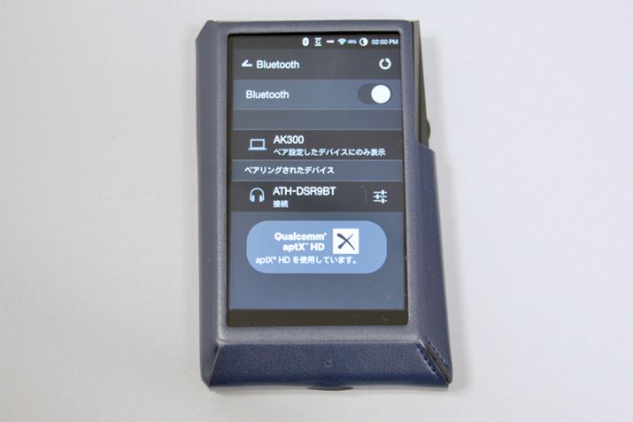 AK300とATH-DSR9BTをペアリングしたところ。aptX HD対応製品同士のペアリングが成功すると、aptX HDロゴが表示される