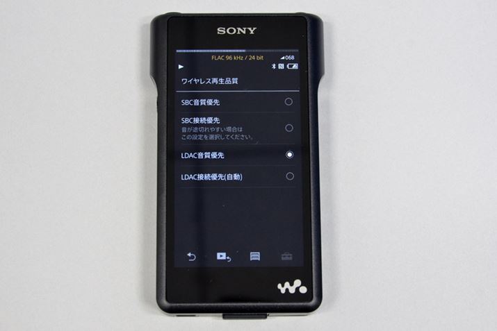 LDACに対応したNW-WM1Aに、同じくLDACに対応したMDR-1000Xをペアリングしたところ。ウォークマン側では、接続品質を音質優先と接続優先の2つから選択できた