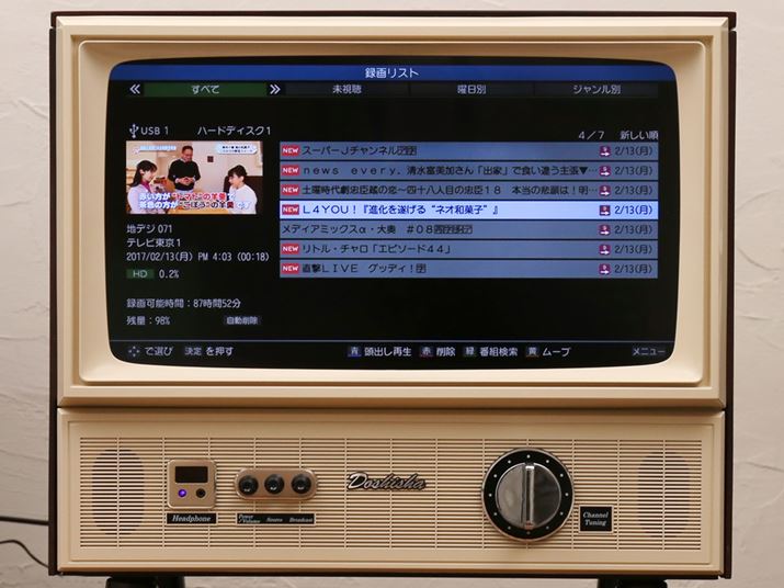 液晶パネルは20V型のハイビジョン(1366×768)パネルで、バックライトにはLEDバックライトを採用。地上・BS・110度CSの3波対応デジタルチューナー(CATVパススルー対応)を1基搭載しています。欲を言えばチューナーは2基搭載してほしかったところですが、外付けのUSB HDDを接続することで番組録画が可能です。番組表からの予約録画のほか、ワンタッチ録画や連ドラ予約録画といった機能も利用できます。録画中番組の追っかけ再生、1.5倍速再生、リピート再生なども可能で、ひととおりの録画・再生機能は備わっています。