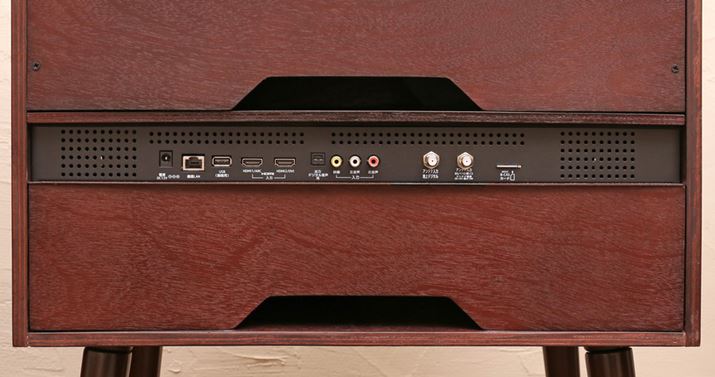 この画像を見ると「これが本当に最新の液晶テレビ?」と感じる方も多いことでしょう。VT203-BRは、れっきとした20V型液晶テレビです。ブラウン管テレビそっくりの箱型筐体を採用し、側面や背面、底面に木材を使用するなど、質感にもこだわっています。テレビを支える長脚もテレビにマッチしたデザインです