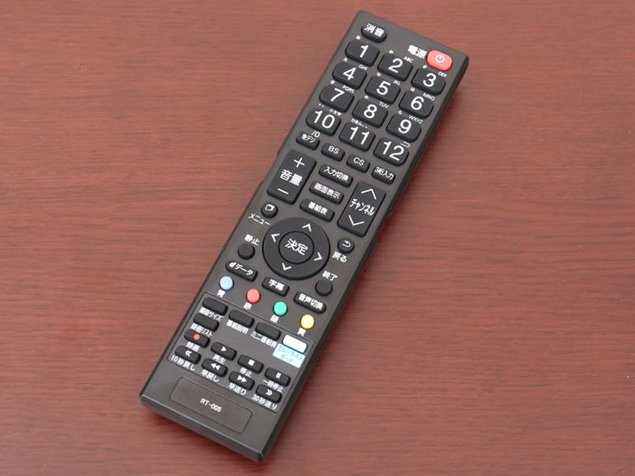 付属リモコン。一般的な液晶テレビのリモコンと同じデザインです。価格を考慮するとデザインでひと工夫ほしかったところ