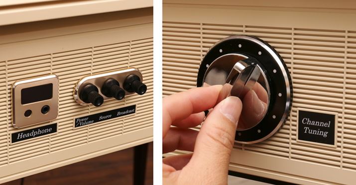 フロント下部は、左からヘッドホン端子、電源/音量スイッチ、入力切り替えスイッチ、放送切り替えスイッチ、チャンネルダイヤルが並びます。これらのスイッチ・ダイヤルは実際に動作します。ダイヤルをガチャガチャと回してチャンネルを切り替える操作が懐かしいです