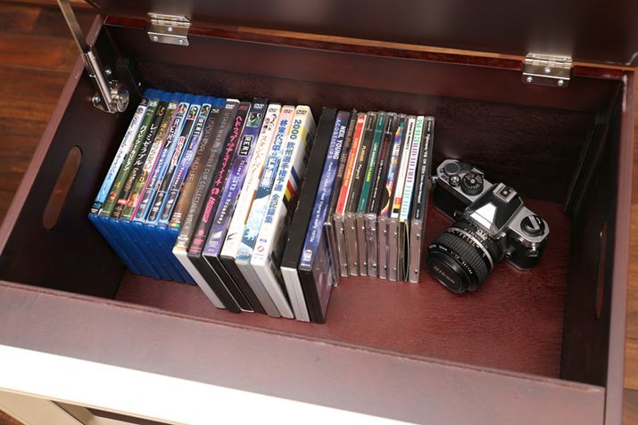 液晶パネル自体はスリムなので、筐体の中にはけっこうな空きスペースがあります。開閉式の天面を開けると、内寸約495(幅)×235(高さ)×285(奥行)mmの収納スペースが現れます