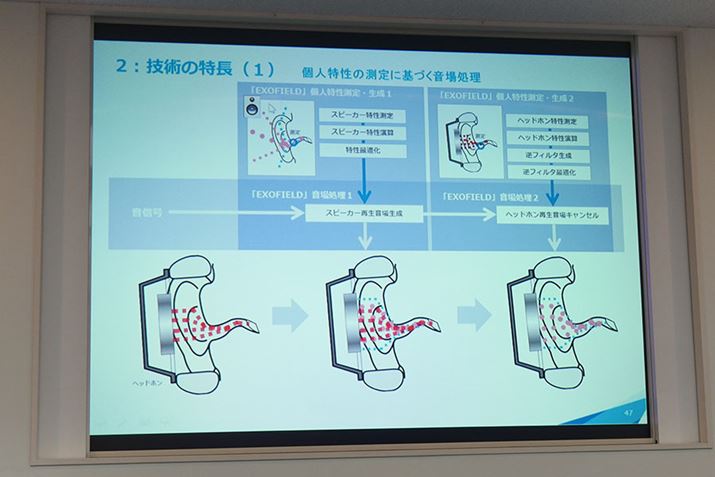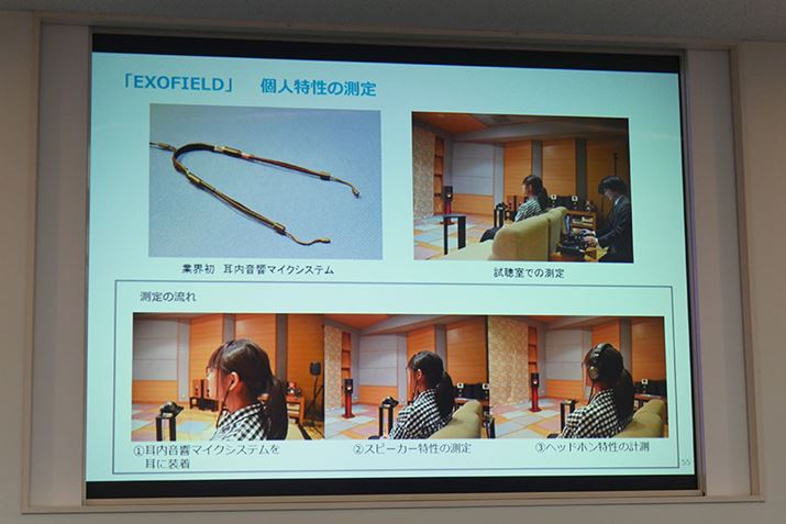 なお、同技術は、スマートフォンアプリなどへの実装も可能とされており、個人特性情報をインストールすることで、場所を問わず最適な頭外定位音場を楽しめるとのこと。同社のスタッフによれば、既存のヘッドホンでも対応可能ということだ(ただヘッドホンの性能によって再生音のクオリティは異なる)。この技術は、ハイレゾ音源やマルチチャンネル音源などもにも応用でき、ホームシアターやVRをはじめとする立体音場のヘッドホン再生にも適用できるとされている。