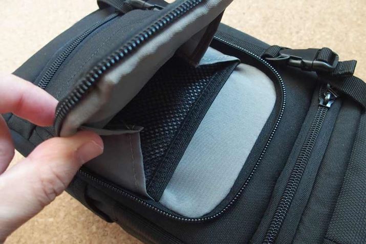 サイドポケットです。厚みはそんなにありませんが、レンズフィルターとかSDカードとか、そういったものが入れておけそうです