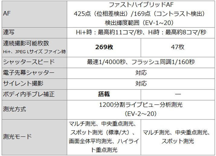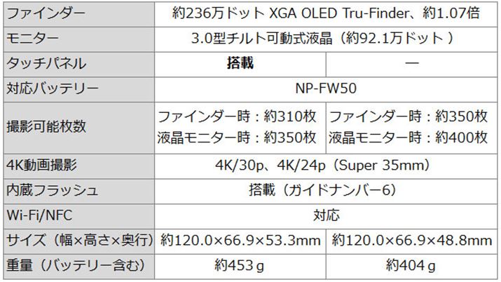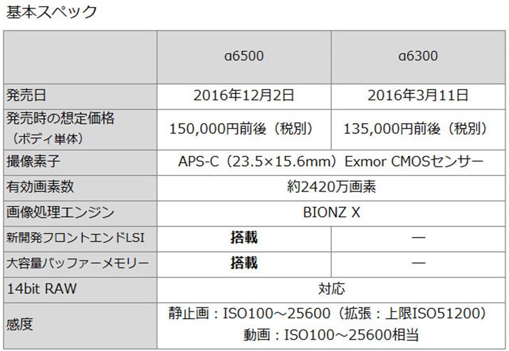 はじめにα6500とα6300の違いをおさらいしておこう。以下のスペック表をご覧いただきたい。
